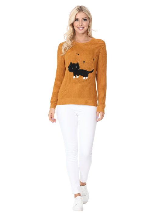 Crewneck Black Cat Applique Embroidery Knit Pullover Sweater MK8207 (S-L)