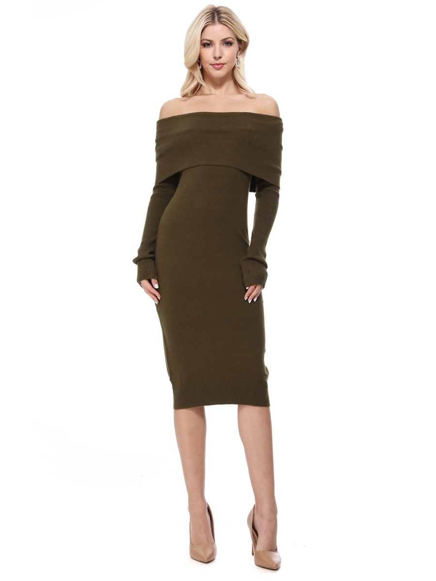 Off Shoulder Long Sleeve Slim Fit Midi Knit Dress MK6022 (S-L)